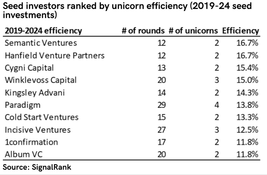 On Feb. 15, 2024, I held a webinar with over 100 investors and founders to discuss my approach to identifying unicorn companies in the Pre-seed. The next day, Signalrank, a Series B venture investor with a large database of investors, published their top 10 most capital-efficient VCs for picking Unicorns. Incisive Ventures is proud to be in the top 10 (they only had the three we did under our Incisive Ventures vehicles, not the other three that were personal investments).