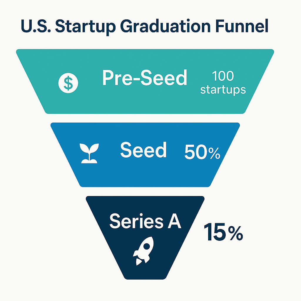 - Pre-Seed → Seed: Roughly 50% of U.S. startups raise a seed round after a pre-seed. This rate has been relatively high but could be softening in the 2023–24 cycle. Pre-seed to seed typically takes ~12–18 months on average.