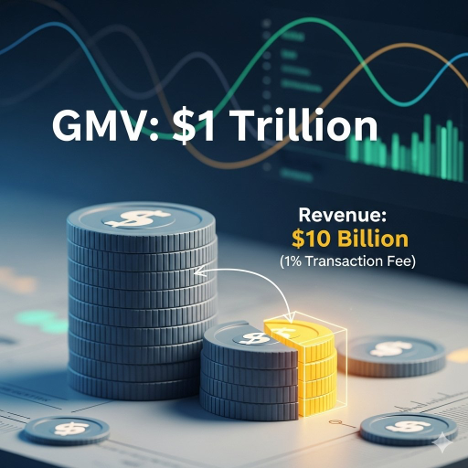 If you clipped a 2 % fee on $100 k of marketplace volume, your revenue is $2 k, not $100 k. Groupon tried the other story; the SEC had thoughts.